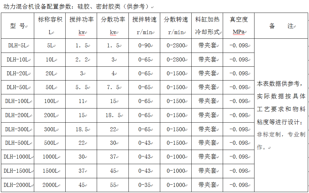 九、MS密封膠行星動力混合機|真空攪拌機配置參數表:(常規的容量、功率、轉速等數據表,其它更大容(róng)積的未作描寫)